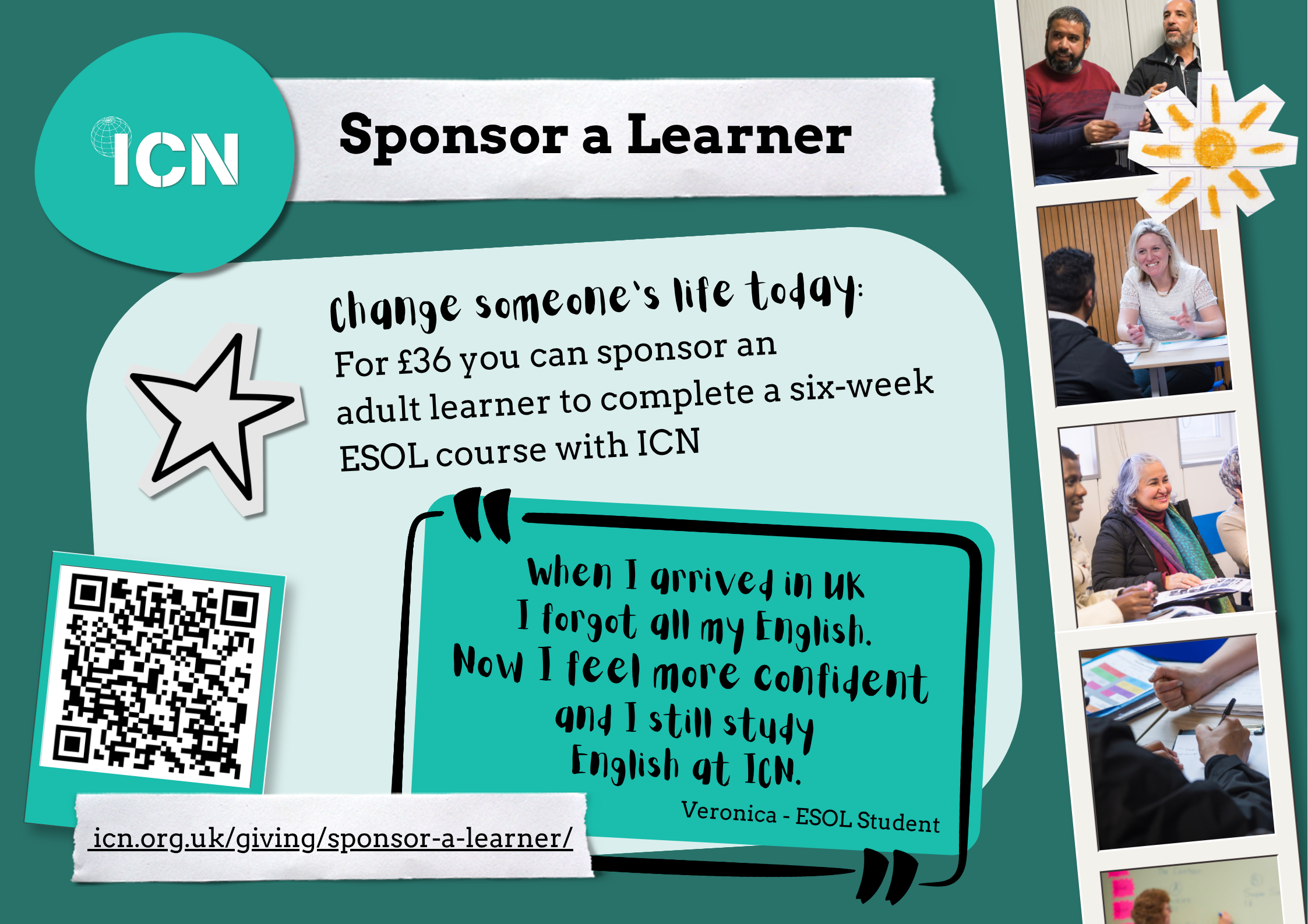 Change someone’s life today: For £36 you can sponsor an adult learner to complete a six-week ESOL course with ICN. Donate via Paypal or get in touch if you would like to register for Gift Aid or find an alternative way to donate!